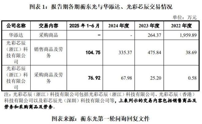 另外,报告期(2022—2025年上半年)各期,蘅东光还与光彩芯辰(浙江)科技有限公司(下称“光彩芯辰”)同时存在采购和销售交易。