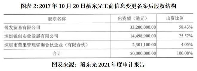 申报IPO前夕,2024年11月27日,彼时新三板挂牌的蘅东光发布了多份公告,其中的2021年度审计报告显示,2017年10月20日,蘅东光进行工商信息变更备案。本次变更后,蘅东光的股权结构分别为锐发贸易有限公司(下称“锐发贸易”)出资58.43%、深圳锐创实业发展有限公司(下称“锐创实业”)出资25.52%、深圳市蕾果管理咨询合伙企业(有限合伙)出资4.05%,三名股东的合计出资比例为100%。
