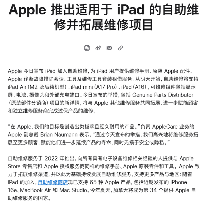 据公告,苹果公司将提供维修手册、原装Apple配件、Apple诊断故障排除会话、工具及维修工具套装租借服务,以保障维修过程专业合规。iPad自助维修服务覆盖的机型包括iPad Air(搭载M2芯片及后续机型)、iPad mini(A17 Pro芯片机型)、iPad(A16芯片机型)三大系列,用户可对显示屏、电池、摄像头和外部充电端口等组件进行自助维修。