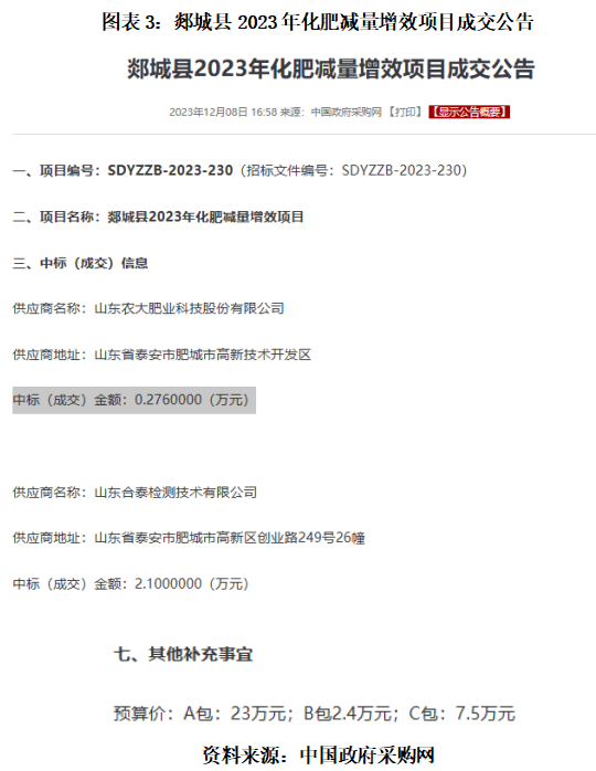此外,农大科技与合泰检测还曾于“郯城县2023年化肥减量增效项目”的不同标段竞标,并最终双双中标。值得一提的是,农大科技在这一项目A包的中标价格为0.276万元,远低于预算价23万元。