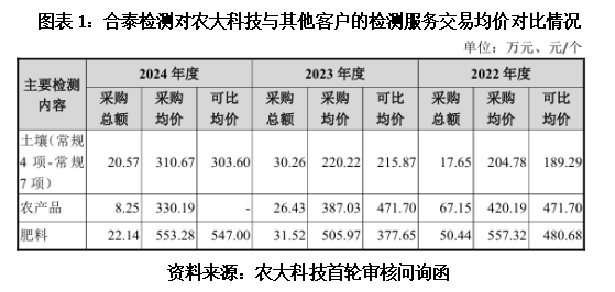 不难发现,报告期各期,农大科技向合泰检测采购土壤和肥料检测服务的均价均高于合泰检测对其他客户的平均交易价格。