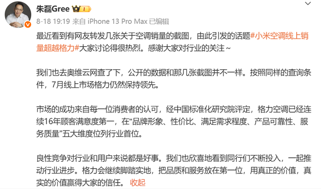 线上空调“二哥之争”没熄火?格力朱磊隔空喊话小米:数据可以转发,口碑没法P图