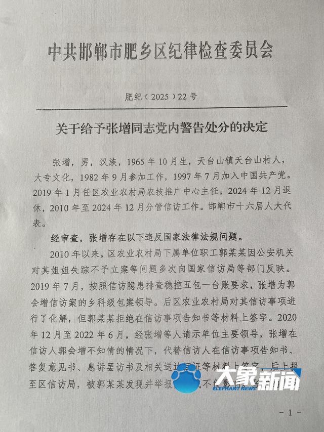 “这次受到党内警告处分的张增,是肥乡区农业农村局的副局长,也是我信访案件的乡科级包案领导;受到记过处分的宋少虎,是区农业农村局信访科科长。”