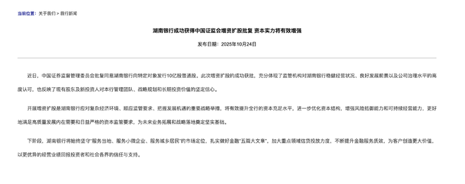 10月24日,湖南银行在官网发布公告称,中国证监会已正式批复同意其向特定对象发行10亿股普通股。值得一提的是,证监会8月反馈意见明确披露,该行本次发行对象共计9名,且均为国有主体。增资后,湖南银行总股本将增至87.5亿股,国有股占比将进一步提升,湖南省政府仍为实际控制人。