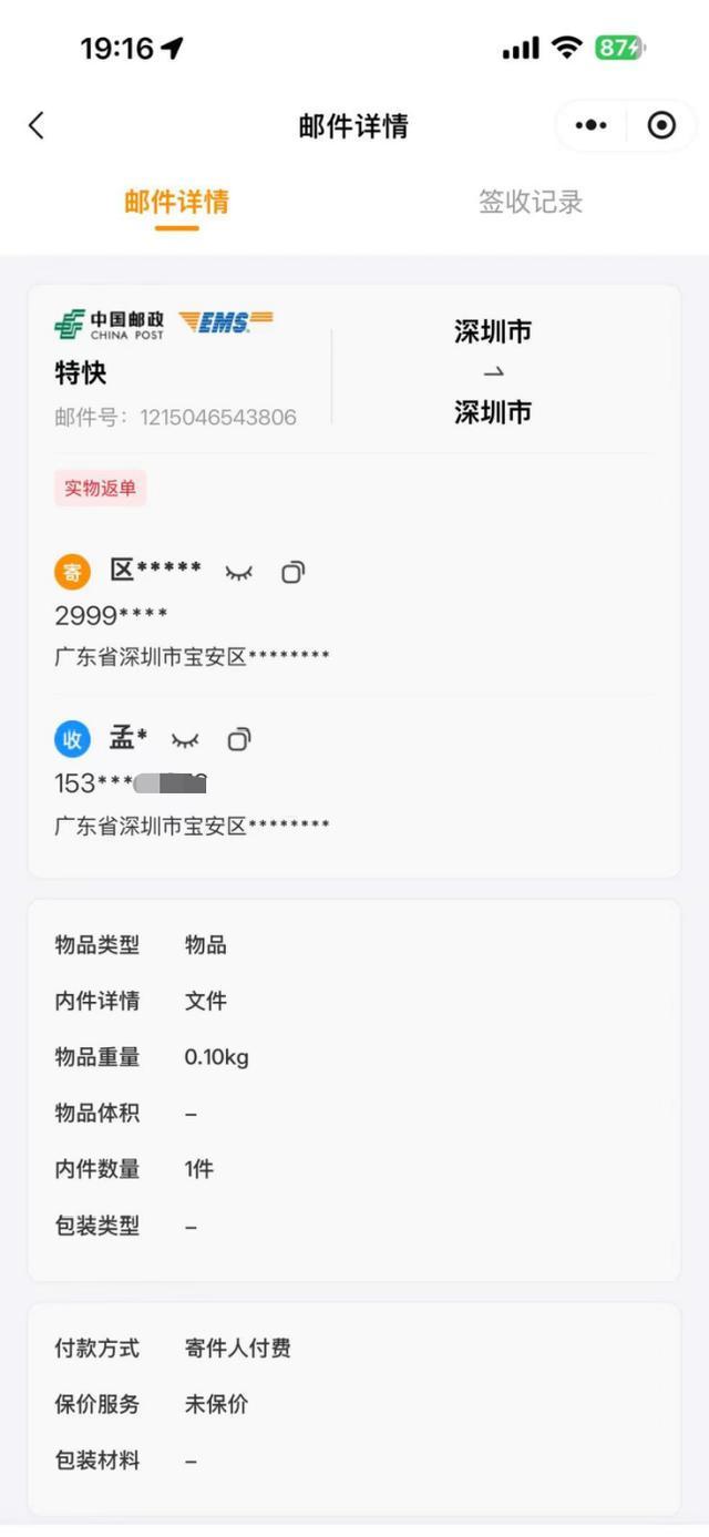 孟先生表示:“从我这邮政EMS小程序看,一旦对方寄出和等我取了快递之后,我就会收到通知,从我的小程序点进去以后,的确显示是我的信息,在下面备注一栏显示的是行政复议决定书,但我收到的却是别人的行政复议延期审理通知书。”