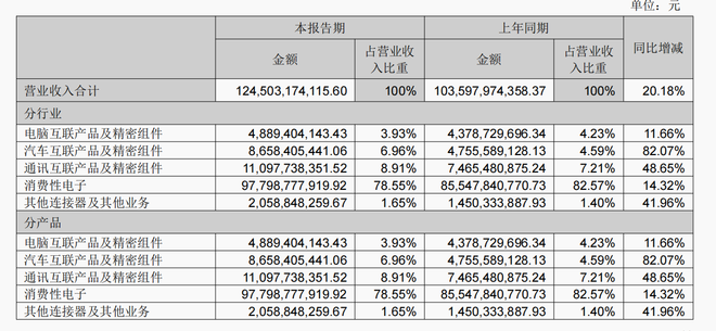 其中,立讯精密上半年营业收入1245.03亿元,同比增长20.18%;归母净利润66.44亿元,同比增长23.13%;归母扣非净利润为55.99亿元,同比增长12.90%。