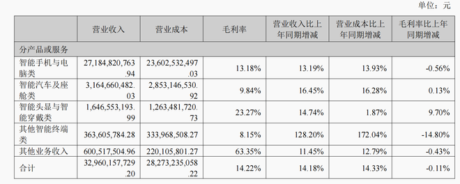 蓝思科技的归母净利润增速最快,其主营业务收入增长主要为公司消费电子和智能汽车业务均稳步增长。其中,智能手机与电脑类业务实现营业收入271.85 亿元,同比增长13.19%;智能汽车与座舱类业务实现营业收入31.65 亿元,同比增长16.45%;智能头显与智能穿戴类业务实现营业收入16.47亿元,同比增长14.74%。