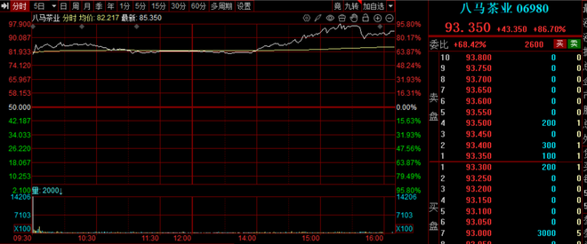 10月28日上午九时,八马茶业(06980.HK)正式在港交所开始买卖,股价开盘便一度上涨超60%,截至收盘时,股价为93.35港元/股,涨幅达到86.70%。