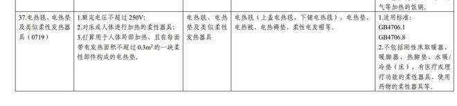 记者联系国家市场监督管理总局,接线工作人员表示,目前强制性产品认证(3C认证)的目录共16大类96种产品,具体范围详见《强制性产品认证目录描述与界定表》,该表中对于电热毯、电热垫及类似柔性发热器具(0719)的描述为“1、额定电压不超过 250V;2、对床或人体进行加热的柔性器具;3、打算用于人体局部加热、且在每面带有发热面积不超过 0.3m²的一块柔性部件构成的电热垫。”