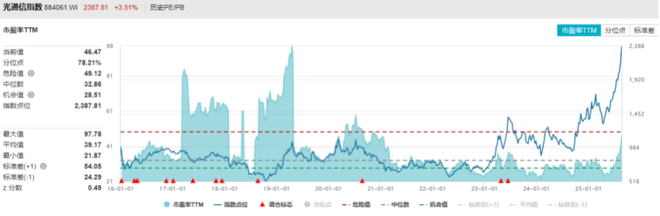 光通信指数市盈率TTM最新值达到 46.47 ,历史分位点为 78.21% 。但从业绩增长趋势来看,年底业绩的释放将有效消化估值压力。(数据来源:wind,截至2025/8/22)