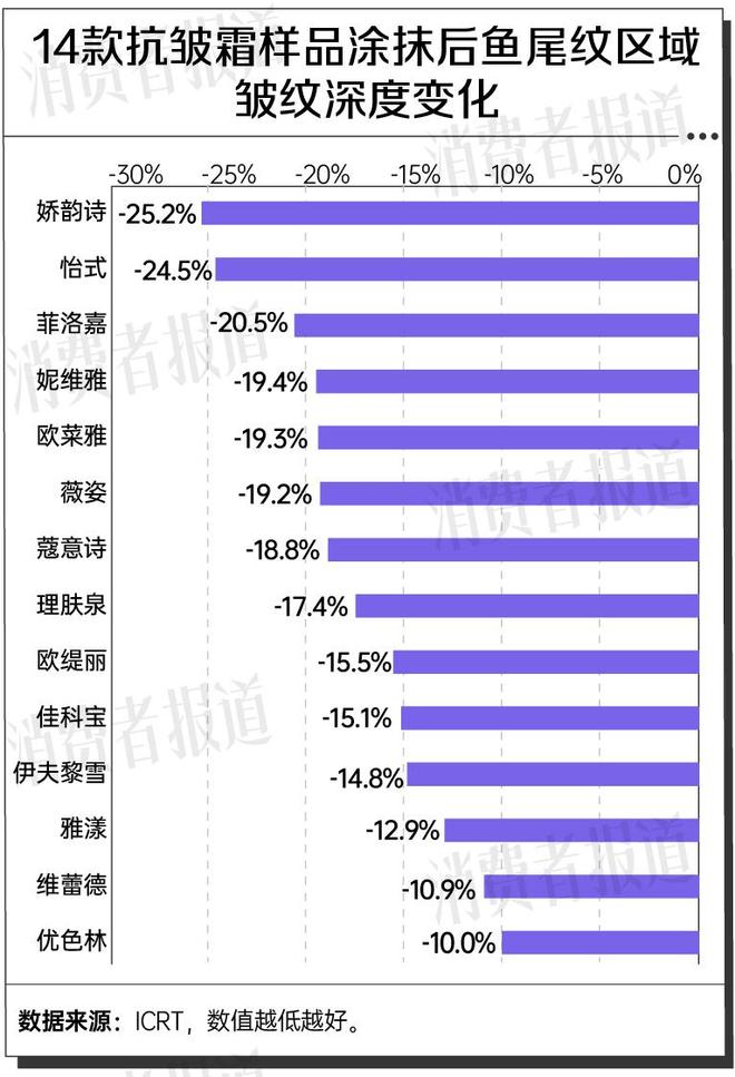 测试结果显示,14款抗皱霜样品均显示出一定的抗皱效果。其中,娇韵诗、怡式、菲洛嘉3款样品的抗皱效果较明显,鱼尾纹区域皱纹深度变化率均低于-20%。相比之下,欧丽缇、佳科宝、伊夫黎雪等6款样品的抗皱效果相对欠佳,皱纹深度变化率皆低于测试均值(-17.39%)。