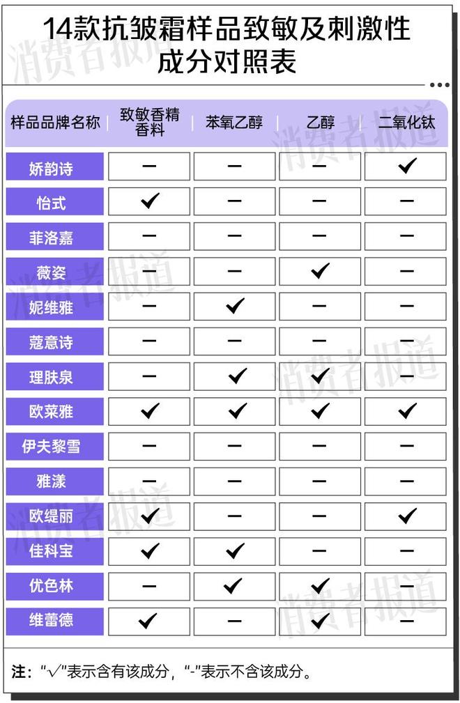 对于敏感肌或注重成分安全的消费者,产品的配方是关键考察因素。本次测试将易致敏香精香料、苯氧乙醇、乙醇和二氧化钛等成分列为重点关注对象。