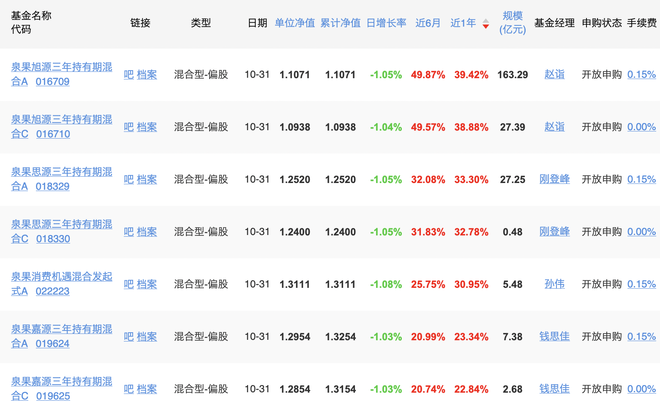 据天天基金网数据,截至今年9月末,泉果基金的管理规模为237.25亿元,基金数量10只,基金经理有5名。从基金产品来看,多数为混合型偏股基金,其中有7只基金近1年的净值增长超过30%。