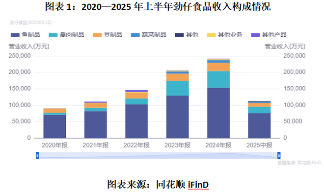 同花顺iFinD数据显示,2020—2025年上半年,鱼制品在劲仔食品营收中的占比虽然从78.01%降至67.32%,但仍是其最大的收入来源。