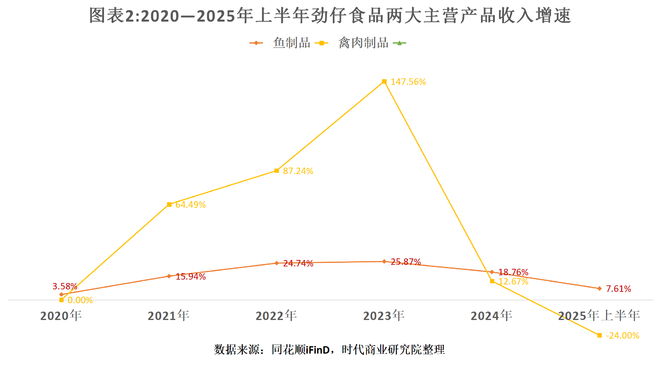 同花顺iFinD数据显示,2023—2024年,劲仔食品禽肉制品收入占比大幅提升到21%左右,成为第二大收入来源。而2025年上半年,其收入占比降至17.45%。
