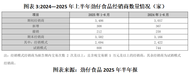 半年报显示,截至今年上半年末,劲仔食品的经销商达3502家,跟去年同期的3166家相比增加了336家。然而,今年上半年,劲仔食品经销模式下的收入同比却下降9.25%,毛利率也下降0.49个百分点。