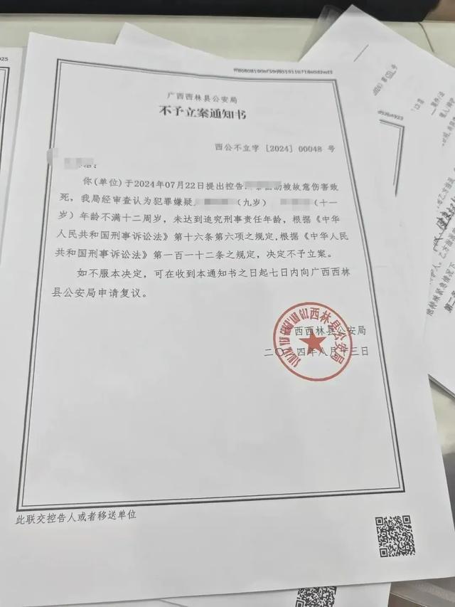 因两名女童不满12周岁,未达到追究刑事责任年龄,西林县公安局决定不予立案。