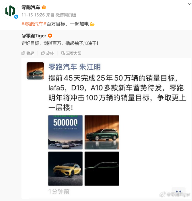 11月15日,零跑汽车在官方账号发文提到,2025年度(零跑)累计销量已超50万台,提前完成年度销量目标。同一天,零跑汽车创始人、董事长朱江明在朋友圈写道,零跑明年将冲击100万辆的销量目标。