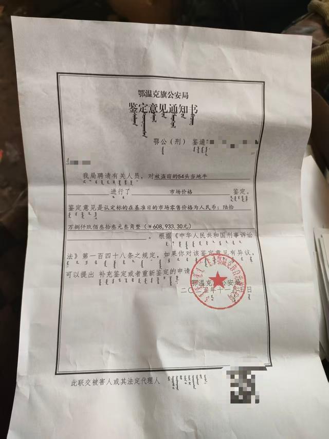 田先生回忆,鄂温克旗公安局委托旗发改委价格鉴定办公室对54头牛进行市场评估,认定总价值为608933.3元。但据警方审理发现,偷牛者已以34万元的低价将牛转卖。“偷牛是懂行人,用远低于市场价进行急售,足以证明这是一场有组织有预谋的盗窃。”田先生猜测,收购方也可能涉嫌明知赃物仍交易,但警方尚未予以回应,款项也暂未追回。