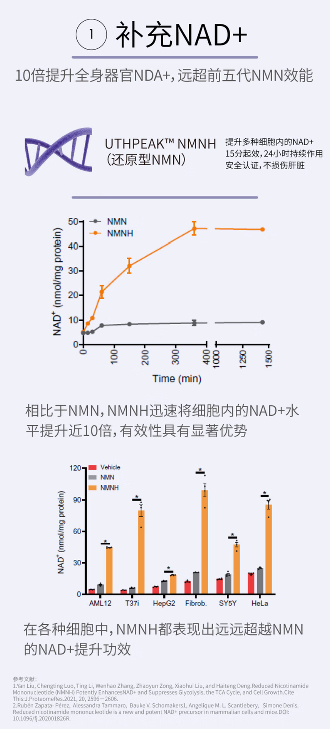 某款NAD+补充剂关于“功效”的宣传:实际上2篇论文的研究模型均为体外培养的多种人类细胞系或活体小鼠 图源:电商购物平台