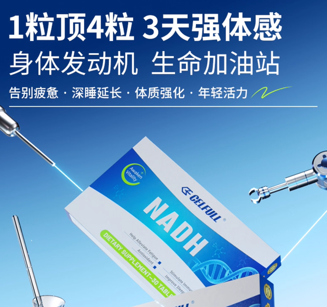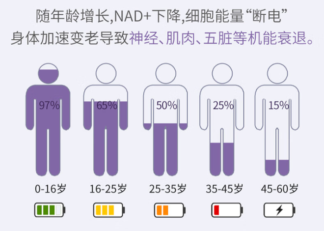 研究表明,随着年龄的增长,NAD+水平会逐渐下降。到50岁时,人体内的NAD+含量大约仅为20岁时的一半。在电商平台上,一些商家形象地将这一现象描述为细胞的“断电”。