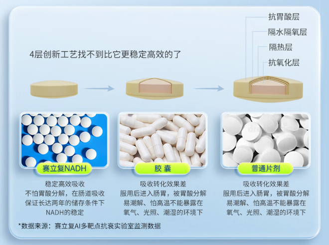 在产品剂型上,这些NAD+补充剂最常见的是胶囊形式,较多商家宣称是“肠溶”。只有AMYKON、kingnature(萃瑞宝)、CELFULL(赛立复)为例外的“片剂”,其中kingnature(萃瑞宝)为舌下含服片,而CELFULL(赛立复)宣称有抗胃酸层、隔水隔氧层、隔热层和抗氧化层,特别提醒“不可咀嚼或含化”。