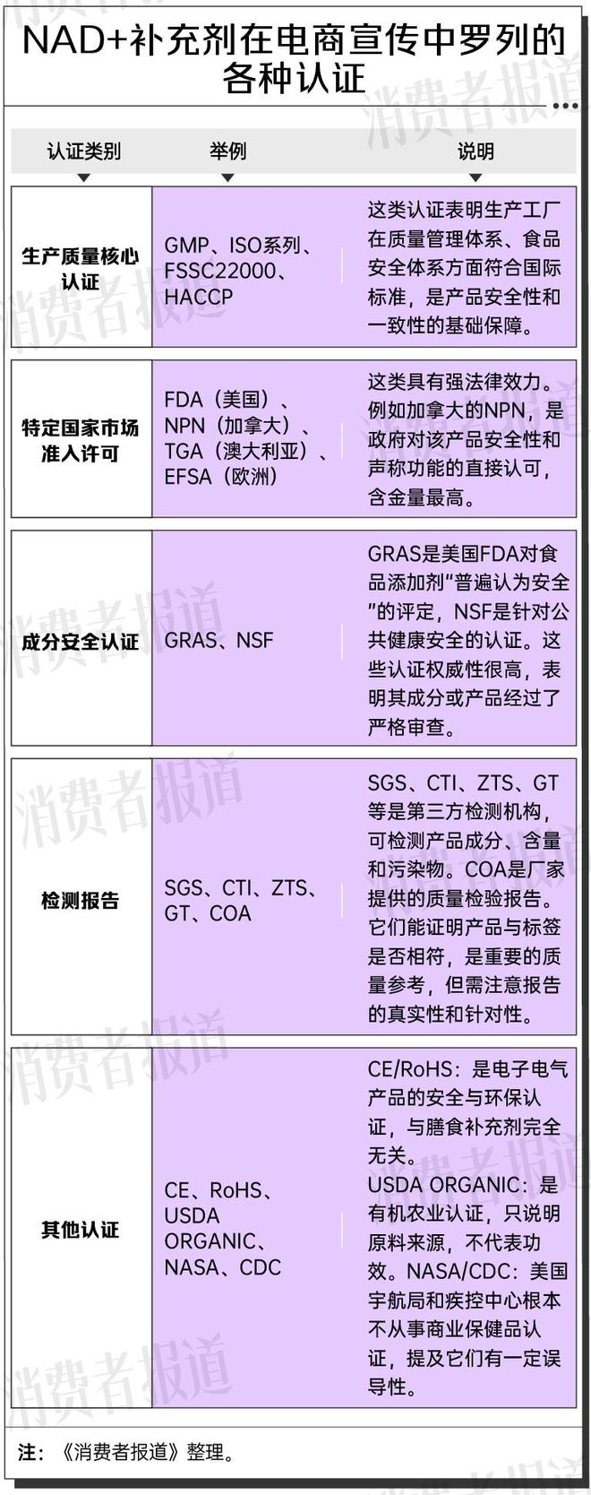 《消费者报道》梳理发现,目前NAD+补充剂的宣传认证良莠不齐。其中,GMP、ISO等体系认证是衡量生产企业质量管控能力的重要参考,但一些产品的宣传中却出现了根本不为膳食补充剂提供产品认证的机构名称,例如NASA(美国国家航空航天局)、CDC(美国疾病控制与预防中心)等。将这类机构列入认证清单,具有很强的误导性,容易让消费者误以为产品功效得到了这些权威机构的背书。