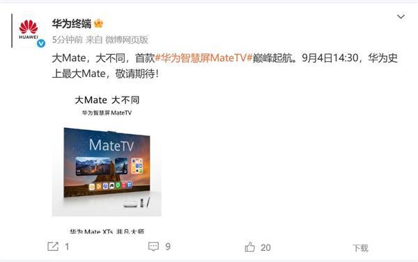 品途网8月29日消息,华为终端官方微博宣布,首款华为智慧屏MateTV将于9月4日14:30亮相,这是华为史上最大Mate,敬请期待。