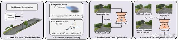 小米汽车团队以3D高斯泼溅(3DGS)为技术基底,创新设计四阶段处理流程:通过视觉衍生"伪点云"实现无激光雷达点云初始化,规避局部最优。