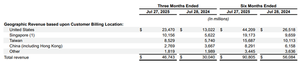 根据NVIDIA的财务报表,新加坡在第二季度的收入占到了公司总收入的22%,在2026财年上半年的收入中占到了21%。