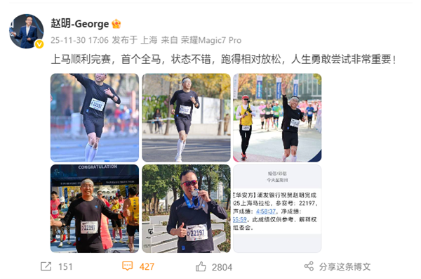品途网12月1日消息,荣耀前CEO赵明日前晒照称"上马"顺利完赛,是自己的首个全马,状态不错,跑得相对放松。