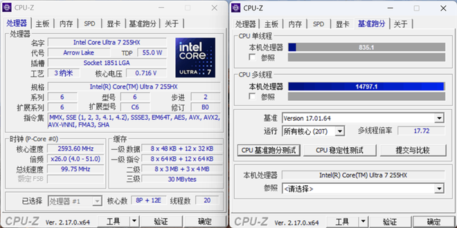 七彩虹将星X16 Pro笔记本搭载Intel酷睿Ultra 7 255HX处理器,在CPU-Z基准测试中,多线程成绩为14797.1,单线程成绩为835.1。