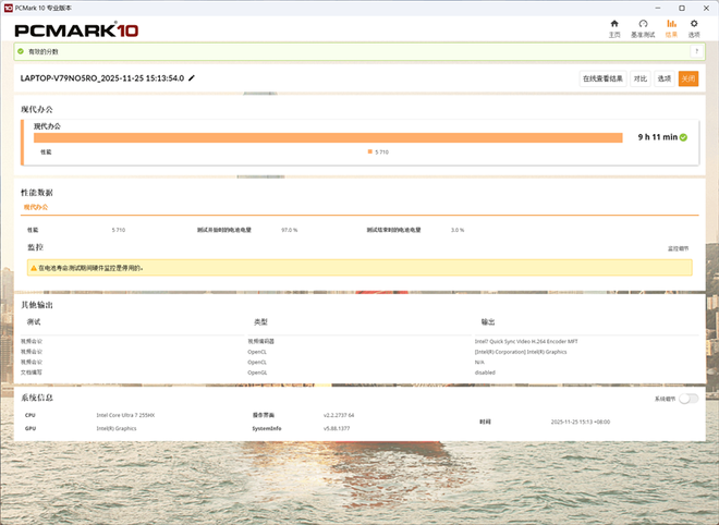 同样设置我们在PCMark10中的电池测试中,使用现代办公项目测试七彩虹将星X16 Pro笔记本的续航,最终续航成绩为9小时11分钟,80Wh的电池足以在办公模式下完成一天的工作。