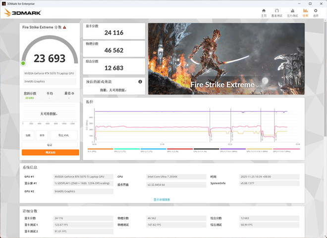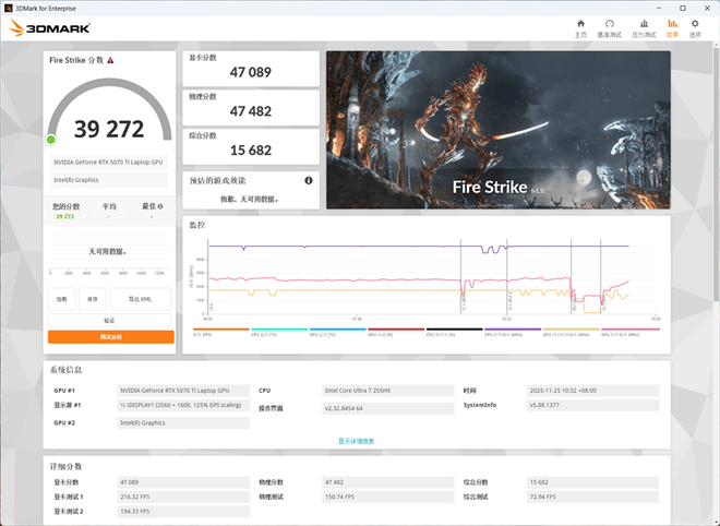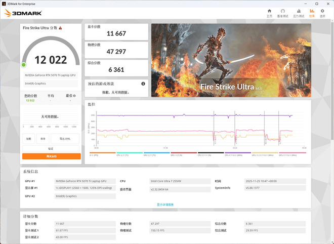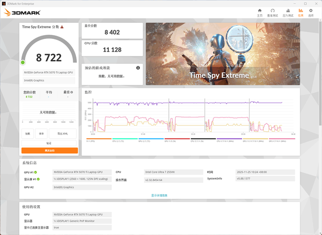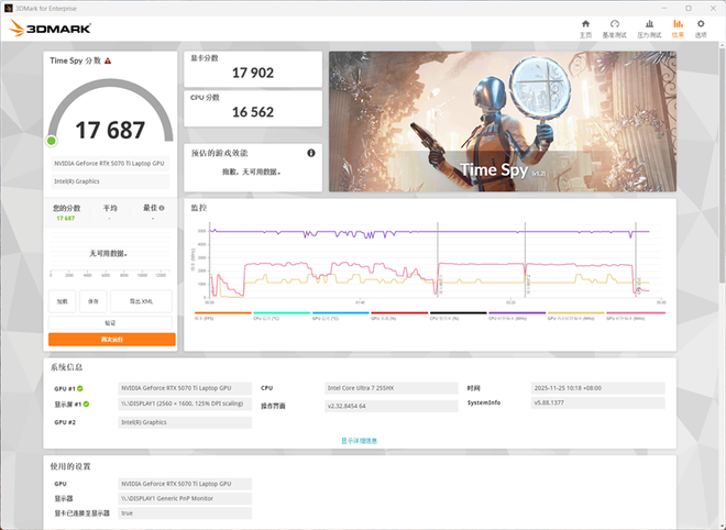 七彩虹将星X16 Pro笔记本搭载的NVIDIA GeForce RTX 5070Ti Laptop显卡,在3Dmark的Time Spy测试中,显卡分数分别为17902和8402。
