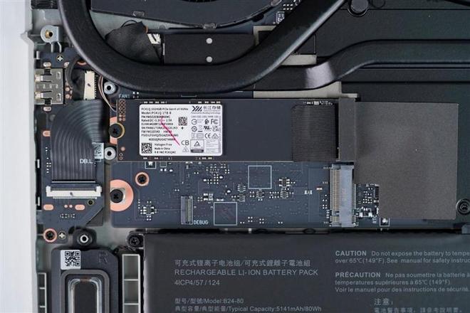 七彩虹将星X16 Pro笔记本提供了两个M.2插槽,其中一个位置已经预装了一条来自长江存储的PC41Q 1TB SSD,还有一个位置空置,方便玩家自行升级拓展存储空间。