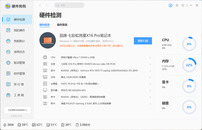 我们拿到的这台七彩虹将星X16 Pro笔记本搭载了Intel酷睿Ultra 7 255HX处理器和NVIDIA GeForce RTX 5070Ti Laptop显卡,并搭配了32GB的DDR 5-5600内存和1TB PCIe 4.0 SSD,在内存价格暴涨的今天,直接把内存拉满,也省去了用户升级的麻烦。