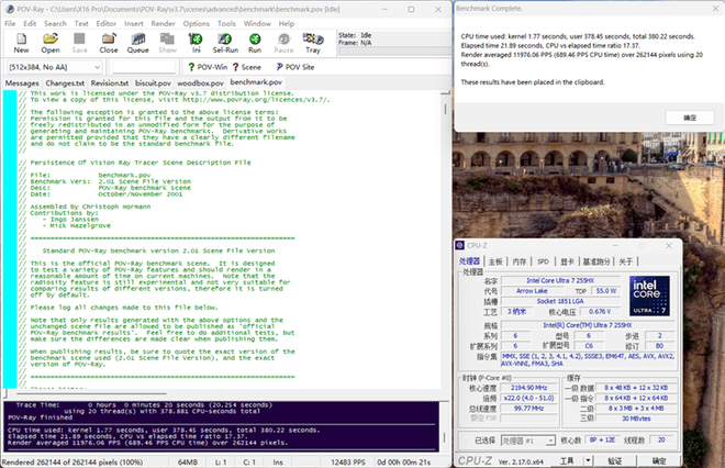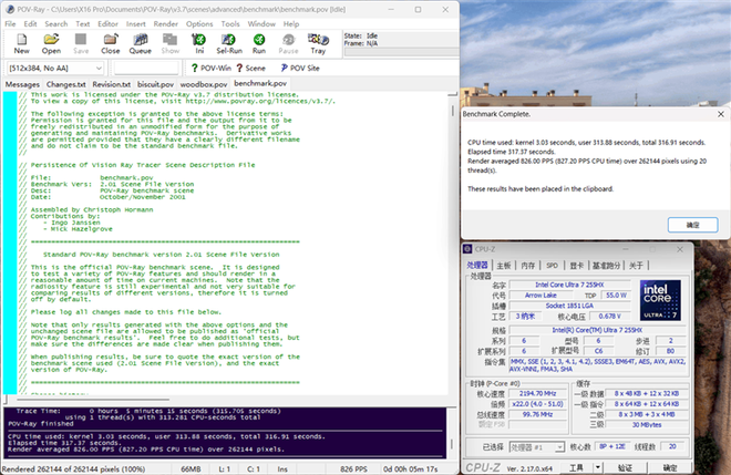 POV-Ray测试中,单核成绩为826.00pps,多核成绩为11976.06pps。
