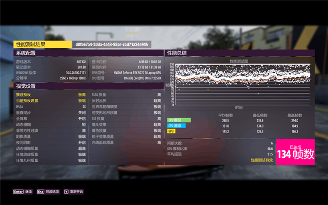 在《极限竞速:地平线5》中,使用2K分辨率极端画质测试,最终测试成绩为134fps。