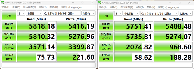 七彩虹将星X16 Pro笔记本自带的长江储存PC41Q 1TB SSD,在CrystalDiskMark测试中,连续读写速度分别达到了5818MB/s和5416MB/s,4K读写速度也能达到75MB/s和221MB/s。