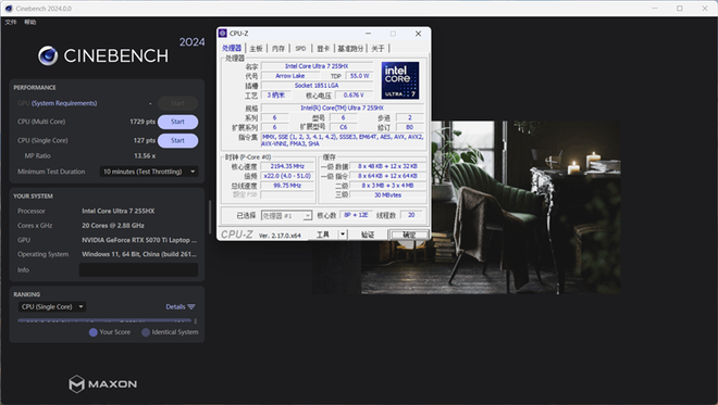 CINEBENCH 2024测试,CPU单核成绩127pts,多核成绩1729pts。