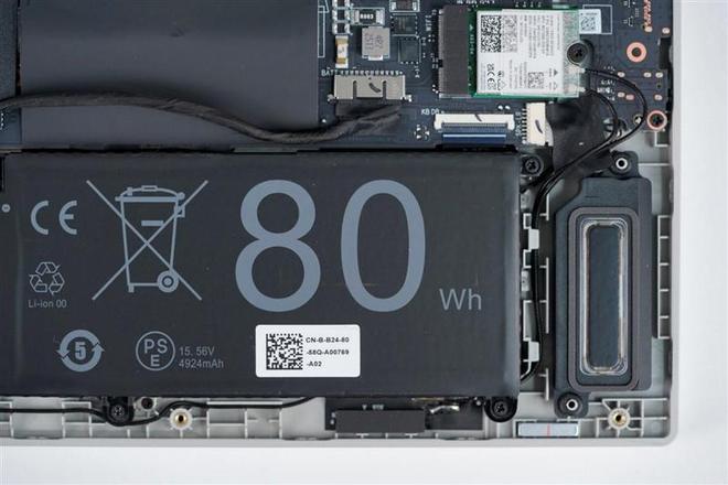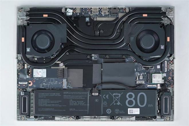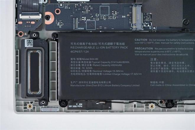 七彩虹将星X16 Pro笔记本内置80Wh电池,电池两次还布置有大型扬声器共鸣腔。