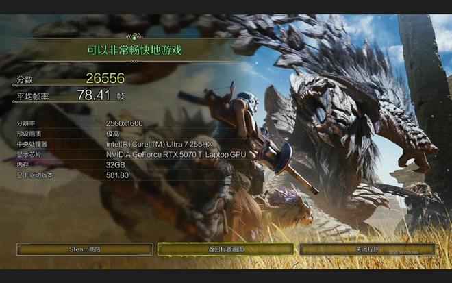 在《怪物猎人:荒野》中,使用2K分辨率和极高画质测试,关闭帧生成时测试成绩为78.41帧,打开帧生成功能时,测试成绩为116.27fps。