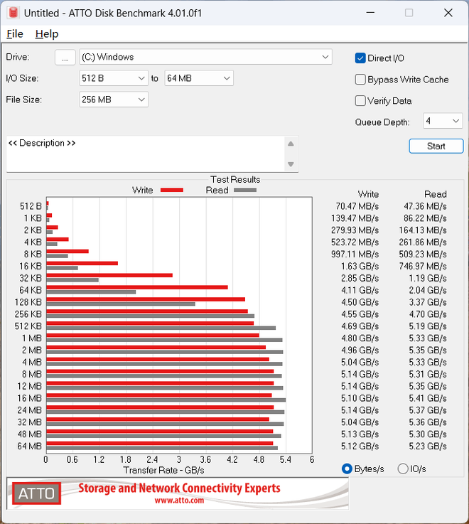 在ATTO Disk Benchmark测试中,长江储存PC41Q 1TB SSD的0.5K小文件读写速度达到了47.36MB/s和70.47MB/s,从16K时开始读写速度都超过了1GB/s,从256K开始速度基本达到最大,写入超过4.5 GB/s,读取超过5GB/s。