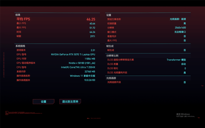 在《赛博朋克:2077》中,使用最高画质预设和DLSS帧生成,记录2K分辨率时的游戏帧数。