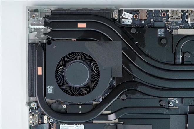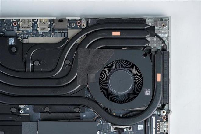 CPU和GPU区域复杂的散热设计,三根加宽热管和一些辅助热管将核心部分热量快速导向风扇散热片。