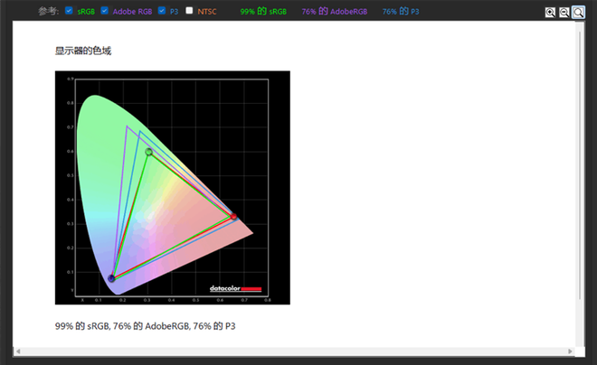 我们使用蜘蛛SpyderX Elite校色仪对七彩虹将星X16 Pro笔记本的屏幕进行测量,可以看到在SDR模式下,七彩虹将星X16 Pro笔记本的屏幕可以覆盖99%的sRGB色彩空间。
