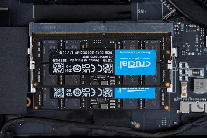 七彩虹将星X16 Pro笔记本预装了两条美光的DDR 5 5600内存,共计32GB容量。