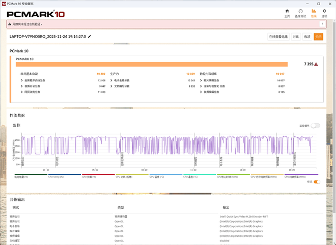 在使用集显时,我们用PCMark10的现代办公进行跑分测试,七彩虹将星X16 Pro笔记本的办公性能得分为7395。