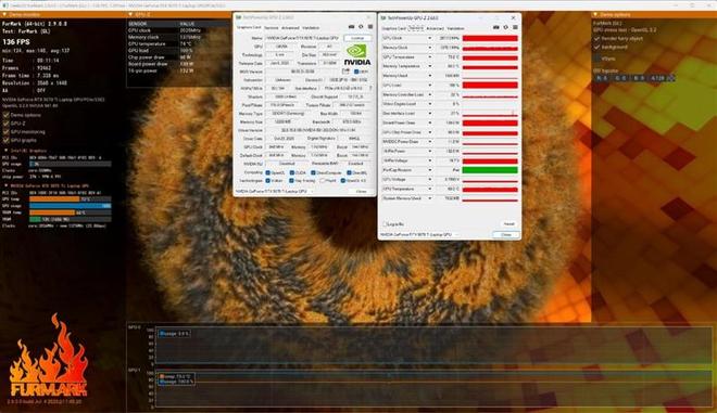 我们使用FurMark对七彩虹将星X16 Pro笔记本搭载的NVIDIA GeForce RTX 5070Ti Laptop显卡进行烤机测试,可以看到在烤机中显卡可以保持140W的稳定释放,核心频率2017MHz,核心温度为73.8度。