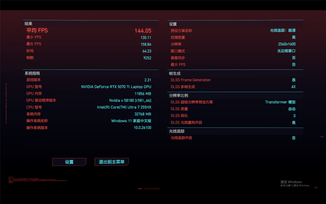 《赛博朋克:2077》在开启DLSS 4最高的4X级别多帧生成时,在2K分辨率下的测试帧率从46.25提高到144.05。